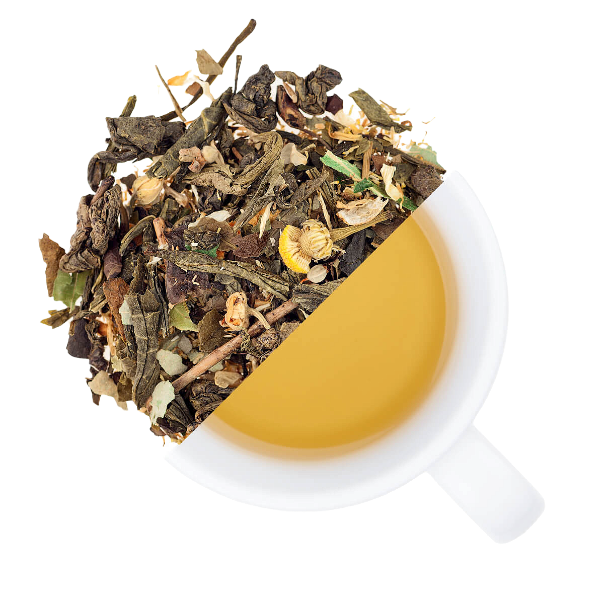 В СОСТАВЕ МИКСА ГЛАВЕНСТВУЮТ ЗЕЛЕНЫЙ ЧАЙ СЕНЧА И ГАНПАУДЕР ПОРОХ, А ОСОБЫЙ ШАРМ ПРИДАЮТ ЕМУ ЦЕЛЬНЫЕ ЦВЕТЫ РОМАШКИ, ЛИПЫ, КОРОЧКИ АПЕЛЬСИНА И ОРГАНИЧЕСКИЕ МАСЛА.