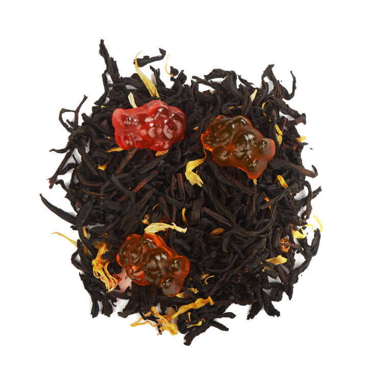 В состав ароматизированного черного чая "Мишки Гамми" входят цейлонский чёрный чай, мармеладные мишки, цельные ягоды клюквы, кусочки ягод клубники, лепестки календулы, ароматические масла. Этот чай очень нравится детям – их привлекают яркие мармеладные мишки, алые клюквенные шарики на тёмном фоне чая и вкусный мармеладный запах. За мармеладным ароматом чувствуется аромат хорошего чая – сладкий, терпкий, невероятно приятный, с оттенками фруктов и цветов. Этот чай ассоциируется с тёплым весенним днём, с пикником на цветущем лугу, с радостным предвкушением чаепития. Вкус В прогретой посуде ярко раскрывается завораживающий аромат этого чая – фруктовый, терпкий, с тягучей мармеладной сладостью и клюквенной кислинкой. Вкус настоя наполнен богатыми оттенками тропических фруктов и сладких ягод, но при этом очень мягкий и нежный. Как заваривать Заваривать при температуре 90-98°C, из расчета 2 чайных ложки на чайник 450 мл, в течение 2-5 мин.