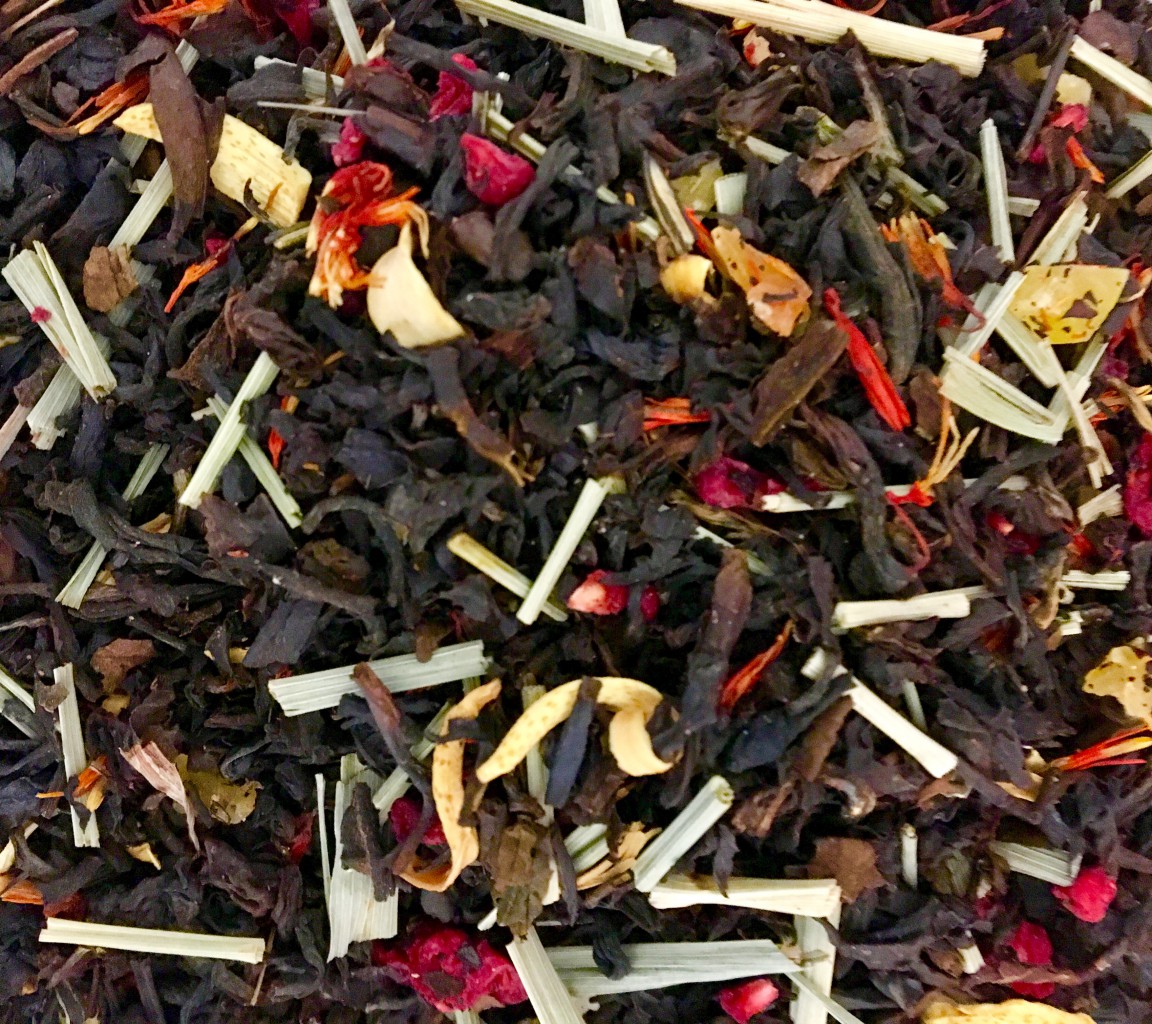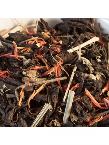 Черный индийский чай и китайский красный чай в сочетании с ягодами малины, кусочками экзотических фруктов, цветами апельсина и лемонграссом.