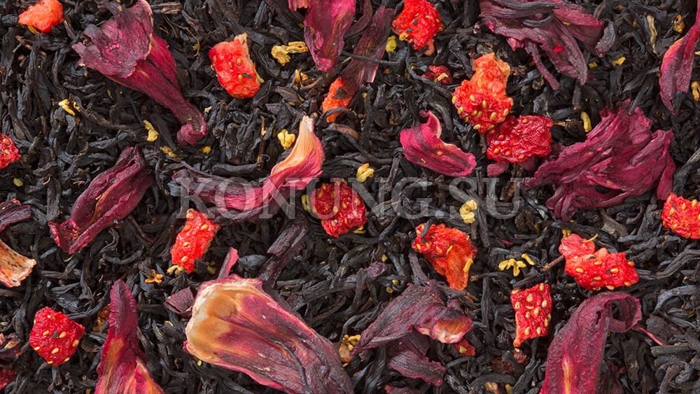 Смесь отборного индийского черного чая, королевского гибискуса, ягод клубники, лепестков османтуса.