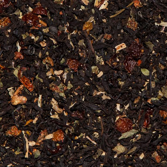 Индийский черный чай с имбирем, мелиссой, зверобоем, крапивой, шиповником, ягодами садовой земляники и облепихи с ярким землянично-вишневым ароматом.