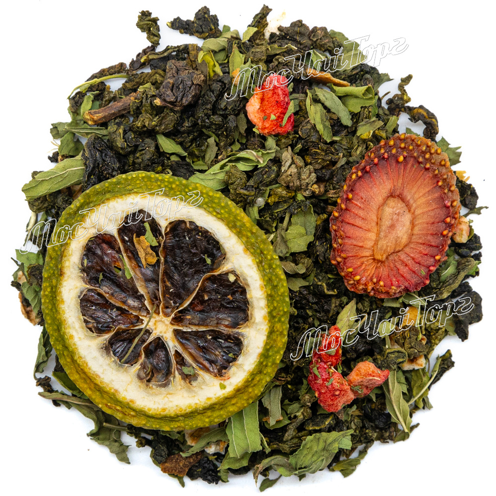 Чай зеленый китайский, мята, дольки лимона, клубника, лимонная цедра, ароматизатор