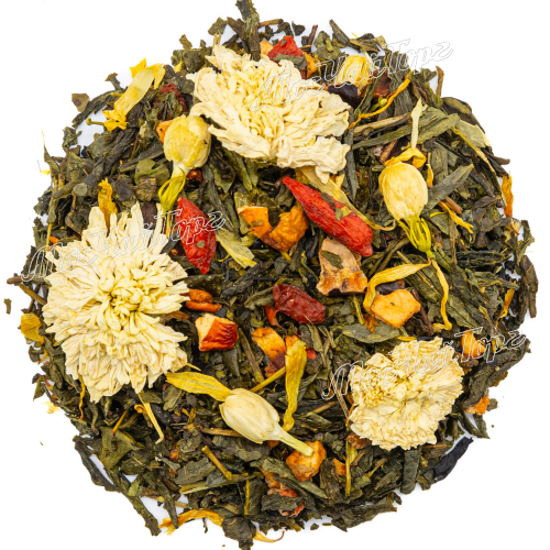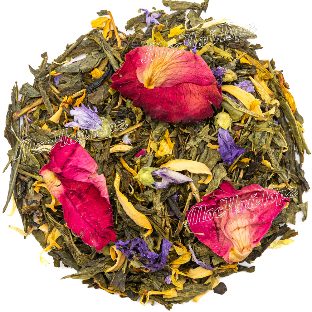 Зеленый чай Утренняя роса (новая рецептура) (Сенча, календула, лепестки розы, мальва, цветки апельсинового дерева, ароматизатор)