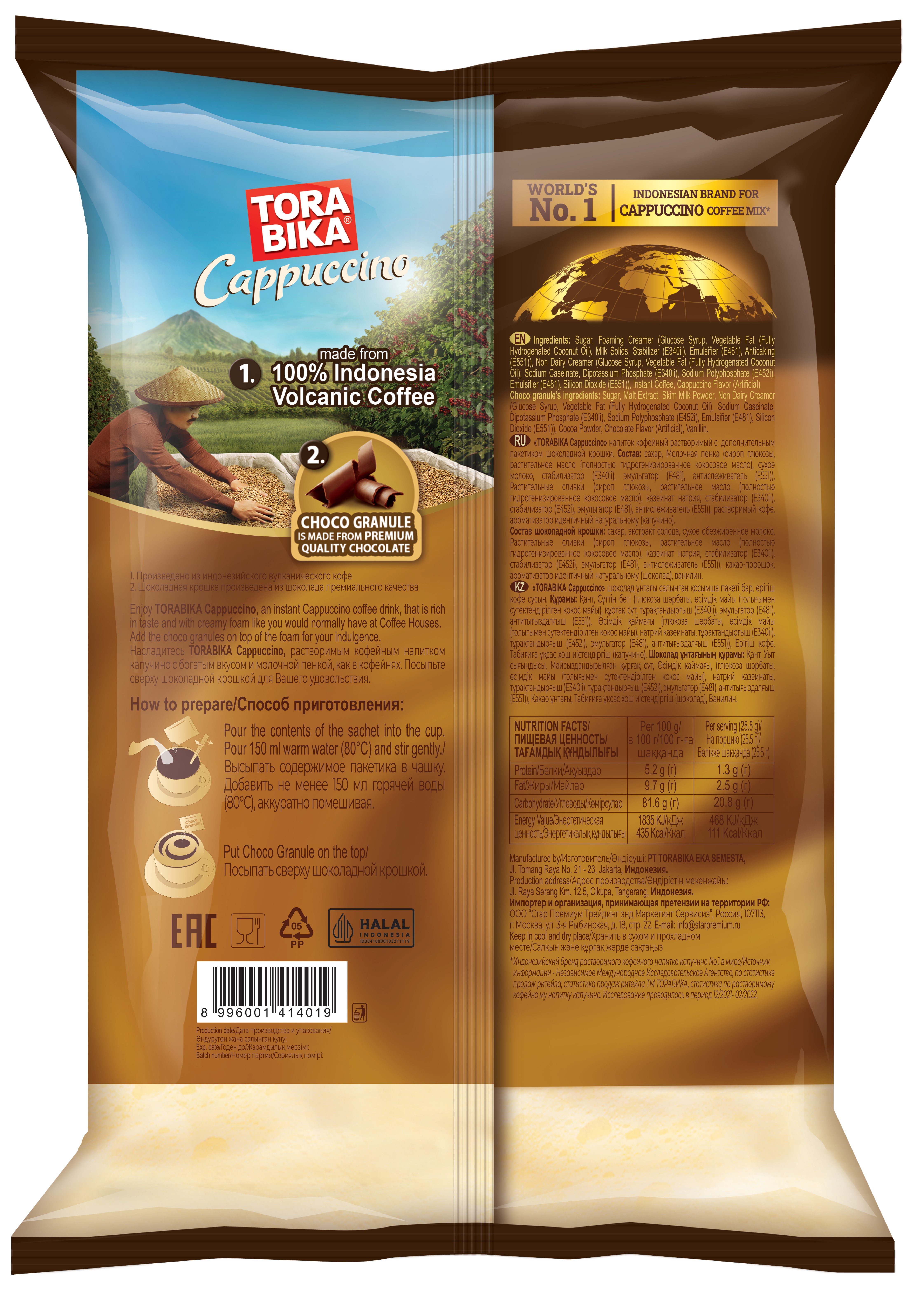 Кофейный напиток Torabika Cappuccino с двойной порцией шоколадной крошки и густой пенкой, приготовленный по итальянскому рецепту, придется по вкусу каждому ценителю капучино.