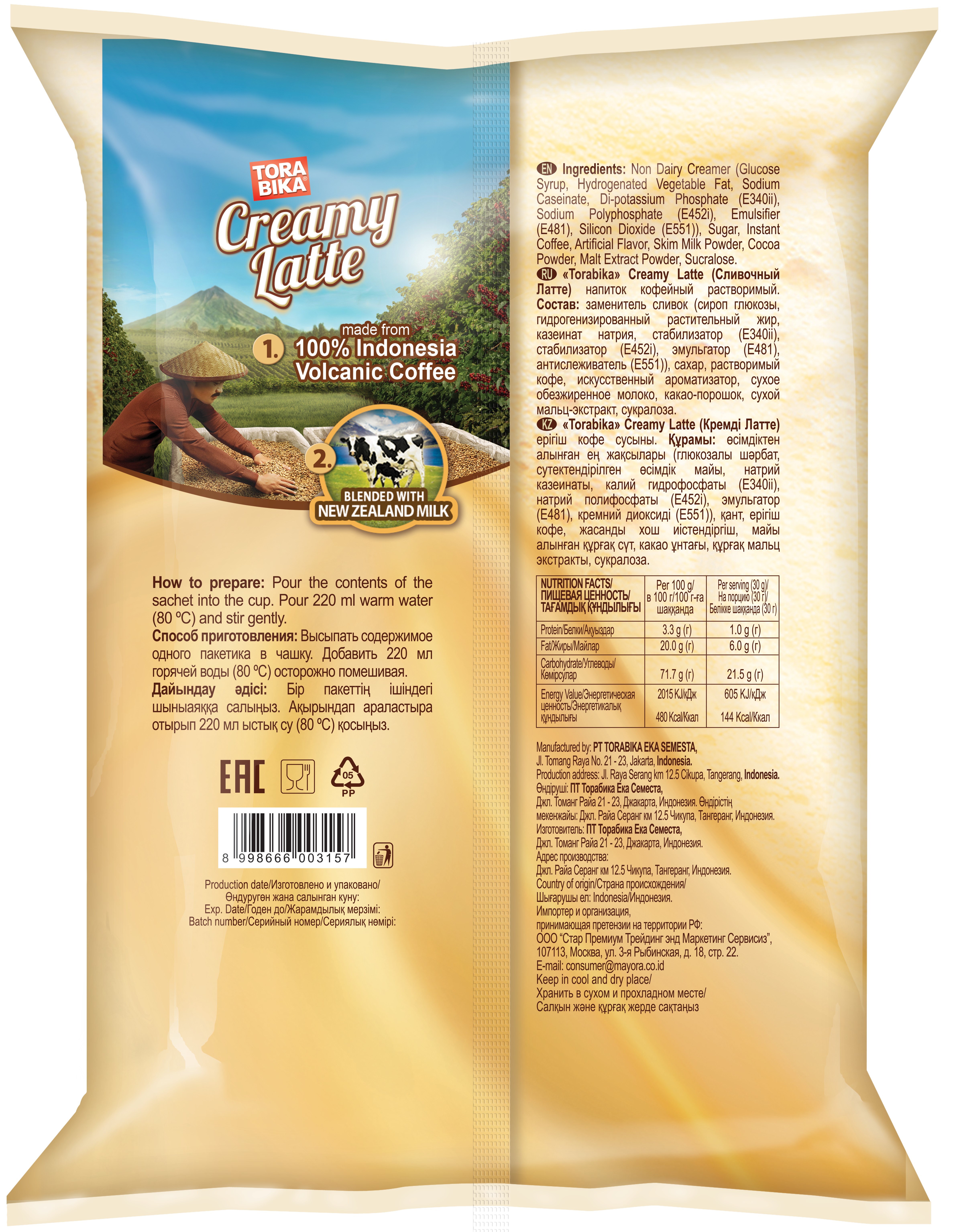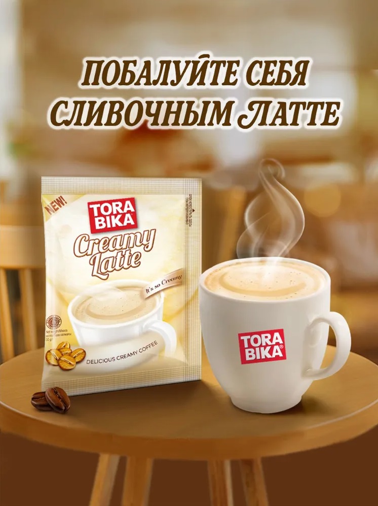 Восхитительный Creamy Latte (Сливочный Латте) от бренда Torabika − это кофе, изготовленный из отборных вулканических кофейных зёрен по самой современной технологии INSTANT COFFEE в Индонезии, с мягким сливочным вкусом новозеландского молока, который не оставит равнодушными настоящих ценителей кофе.
