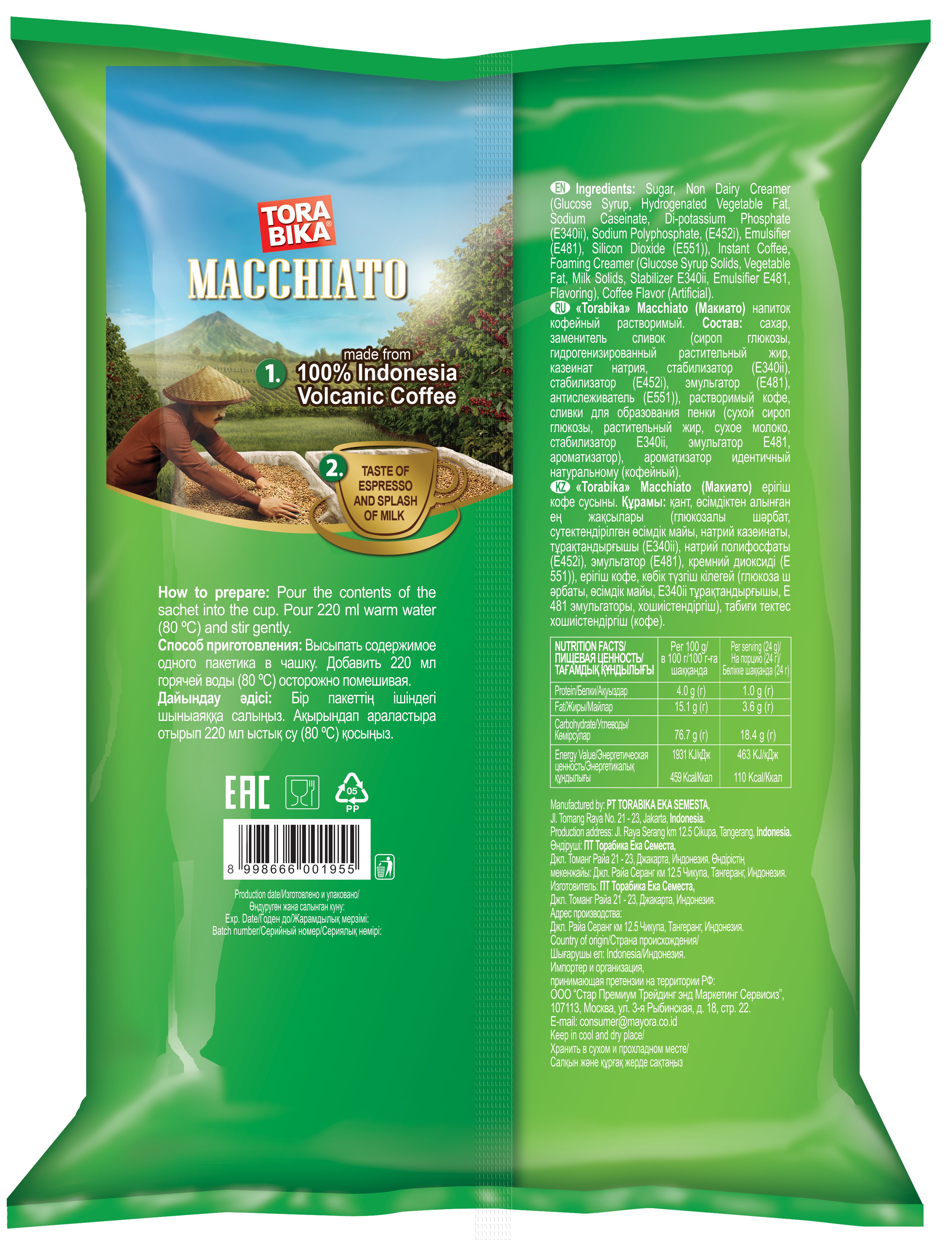 Torabika Macchiato − крепкий кофе с мягким вкусом, с добавлением эспрессо и новозеландского молока, способный взбодрить и зарядить энергией на весь день.