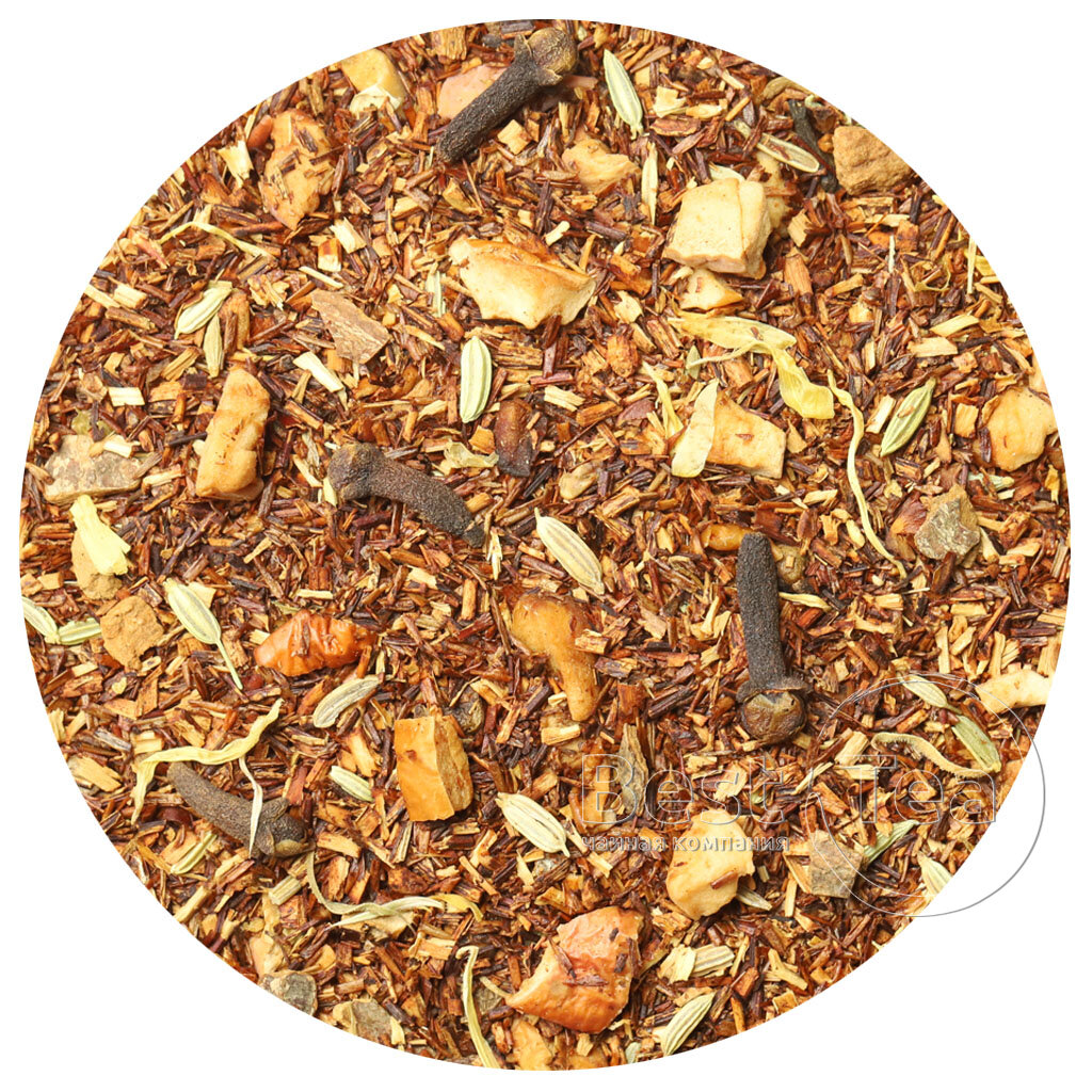 Ройбос, кусочки яблок, кусочки корицы, фенхель, гвоздика, лепестки календулы, аромат свежей выпечки