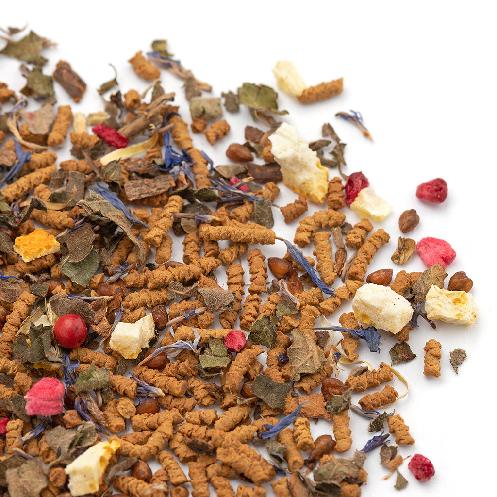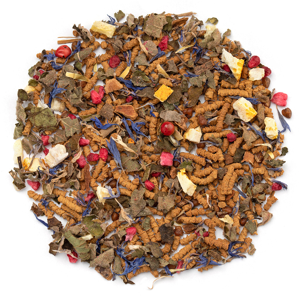 Яркая россыпь на основе экзотического гречишного чая выглядит нарядно и празднично. Восхитительный аромат пряной выпечки с пряничной ноткой, оттенком пряностей и легкой сладостью создают ощущение грядущего волшебного торжества. Состав Гречишный чай, кусочки корицы, листья ежевики, кусочки апельсина с цедрой, кусочки малины, розовый перец, лепестки василька, аромат цитрусов и восточных пряностей.