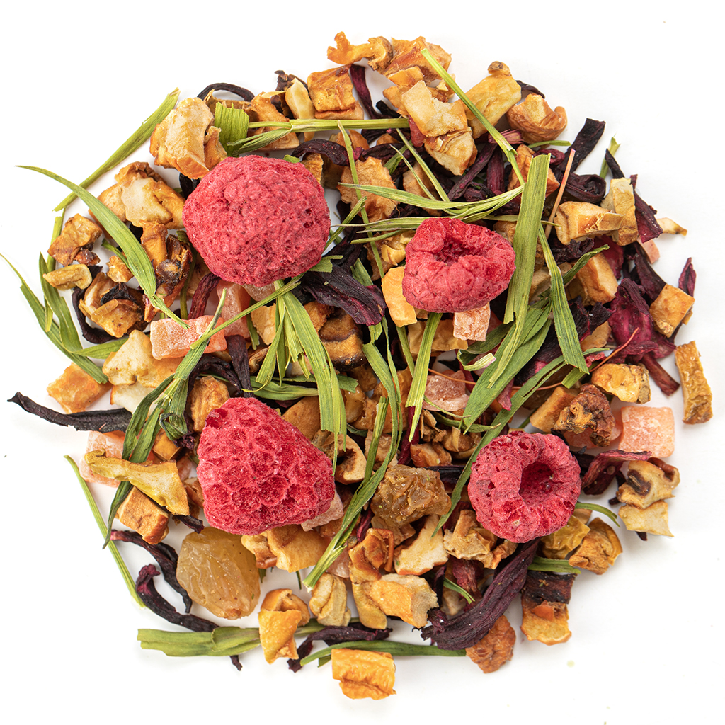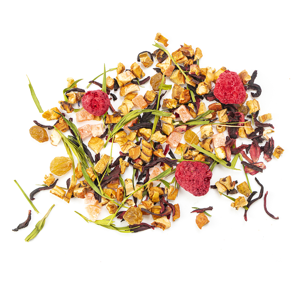 Сочный и яркий фруктовый чай, напоминающий о летнем десерте с садовыми ягодами и карамелизированными фруктами. В его аромате — тёплые оттенки запечённого яблока, ананаса и изюма, а вкус насыщен сладкой малиной, с лёгкой кислинкой и ягодной свежестью. Каждая чашка — как кусочек домашнего коблера: густая, ароматная, с мягкой фруктовой сладостью и еле уловимыми тропическими нотками. Идеален для дневного чаепития, особенно когда хочется чего-то вкусного и без лишнего. Состав: каркаде, яблоко, кубики ананаса, изюм, листья бамбука, ягоды малины, аромат малины