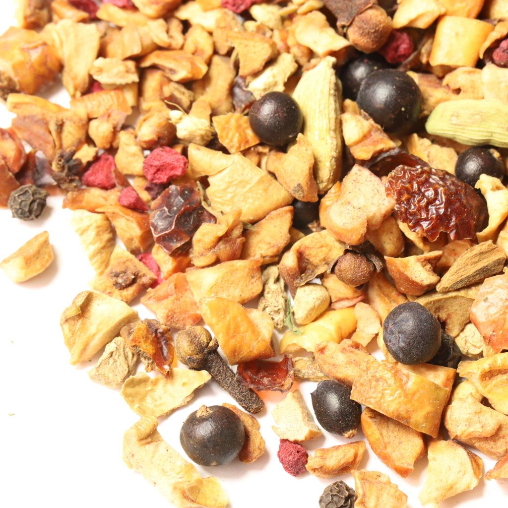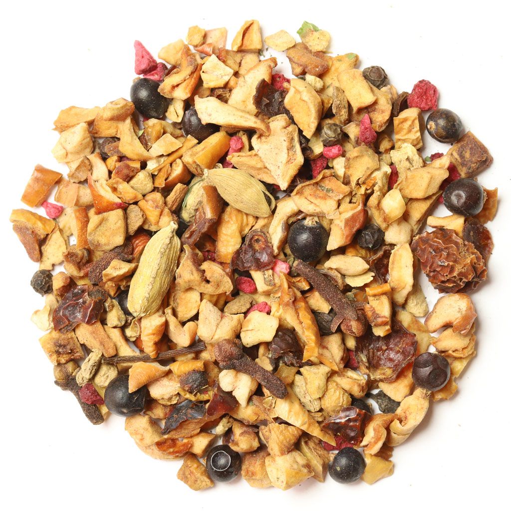 Состав Кусочки яблок, плоды шиповника измельченные, плоды можжевельника, кусочки имбиря, кусочки корицы, мята, плоды кардамона, перец душистый, гвоздика, кусочки малины.