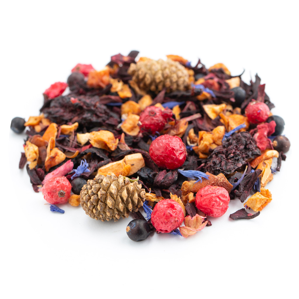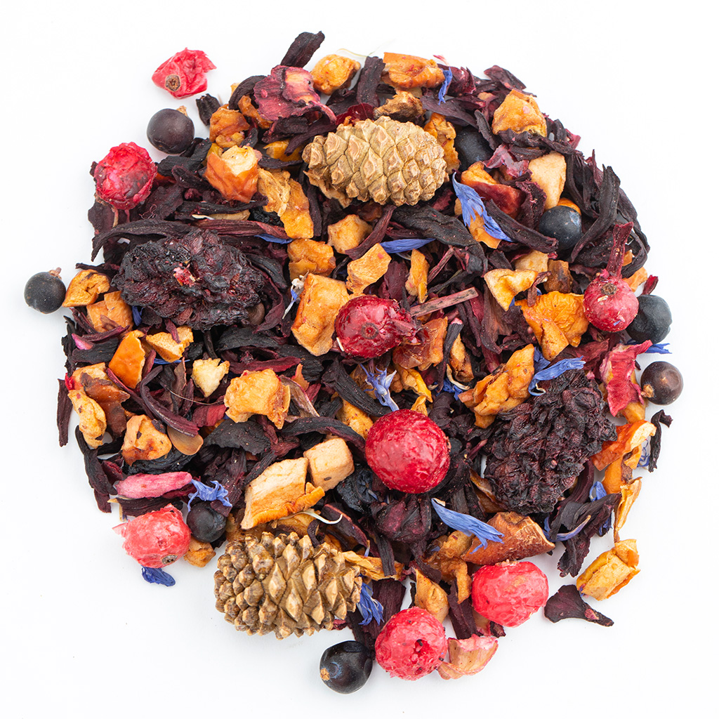 Состав каркадэ, кусочки яблок, сосновые шишки, плоды можжевельника, ягоды ежевики, ягоды красной смородины, ягоды голубики, лепестки василька, аромат бабушкиного варенья