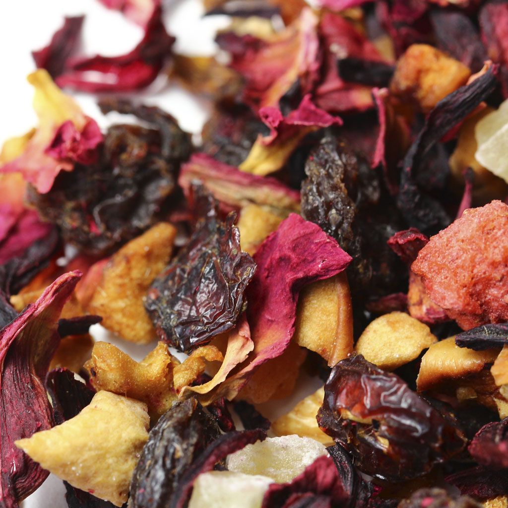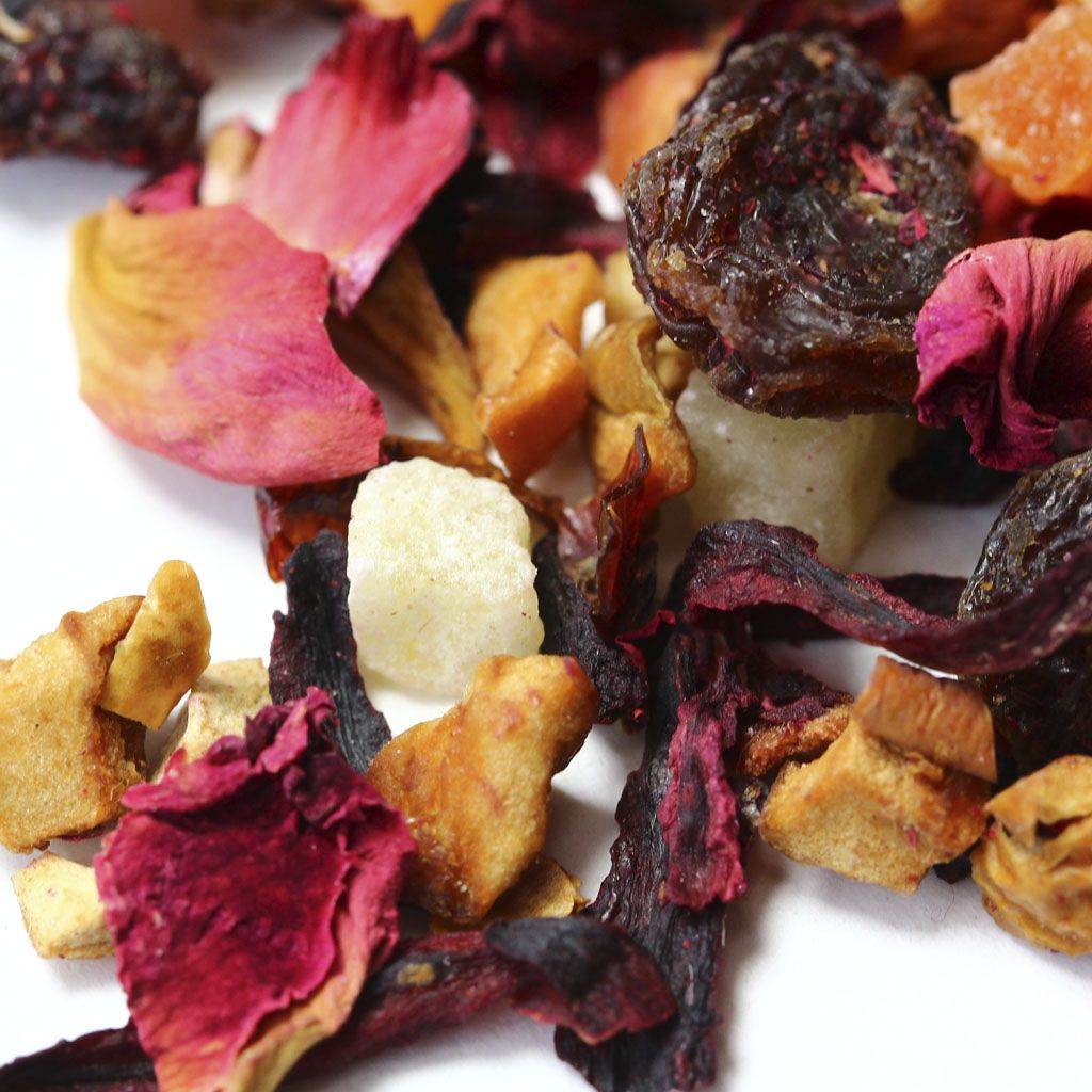 Оригинальное вкусовое сочетание каркадэ, кусочков яблок и ананаса, красного изюма, лепестков красной розы и кусочков клубники творит чудеса, наполняя душу воодушевлением и спокойствием. Оригинальная цветовая гамма сухой смеси варьируется от темно-коричневого до алого, от кораллового до розового, от персикового до желтого. Бархатистый вкус создается удивительно правильно подобранными пропорциями сладости ананаса, изюма и клубники и кислинки яблока и каркадэ. Прекрасное благоухание клубники не оставит равнодушными никого, кто желал бы начать утро с хорошего настроения. Цветочно-травянистый чай отлично смотрится и в состоянии готового напитка. Вы можете купить высококачественный Фруктовый чай Веселый Фрукт в интернет-магазине чайной компании BestTea оптом или в розницу, на выгодных условиях, с доставкой по России и СНГ. Количество чая: 2 чайные ложки Объем и температура воды: 450 мл., 90-95 С Время заваривания: 2-5 минут Состав Каркадэ, кусочки яблок, кусочки ананаса, изюм красный, плоды шиповника измельченные, кусочки клубники, лепестки розы красной, аромат клубники.