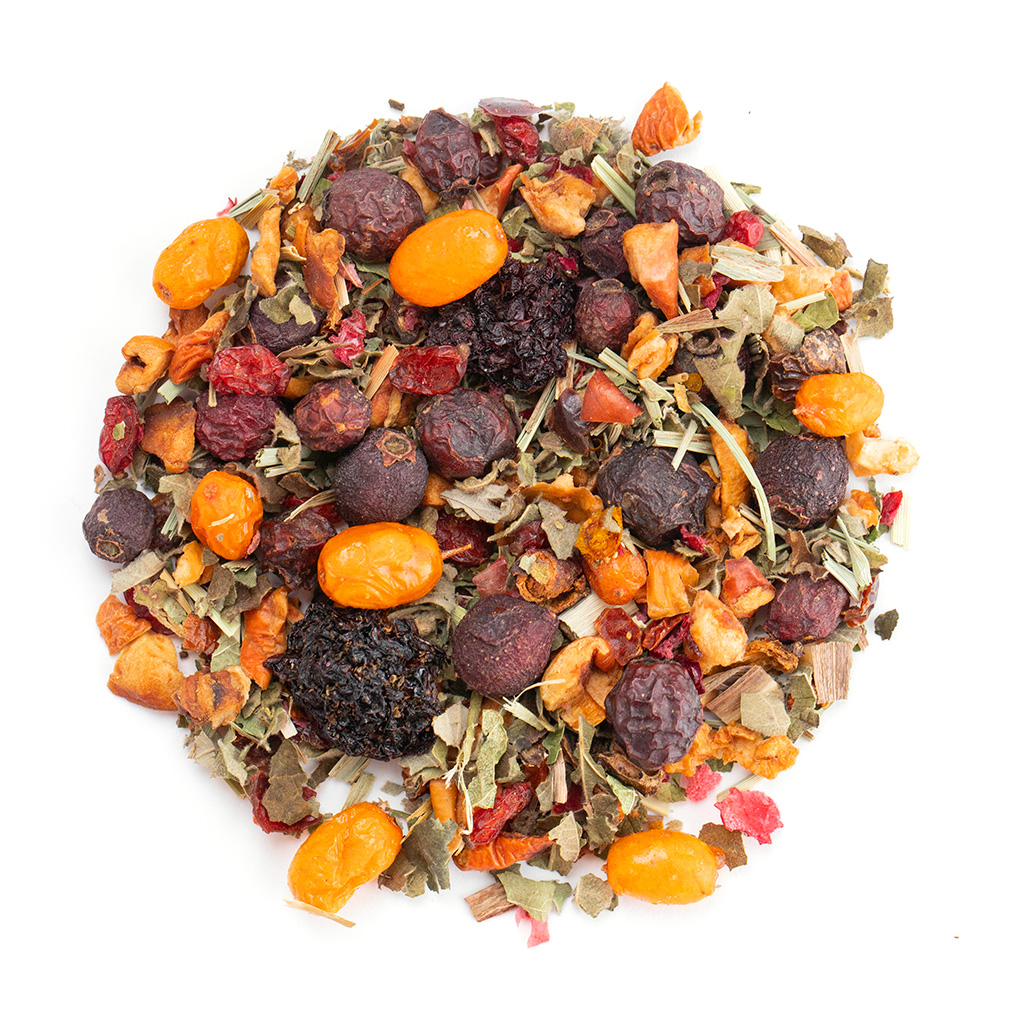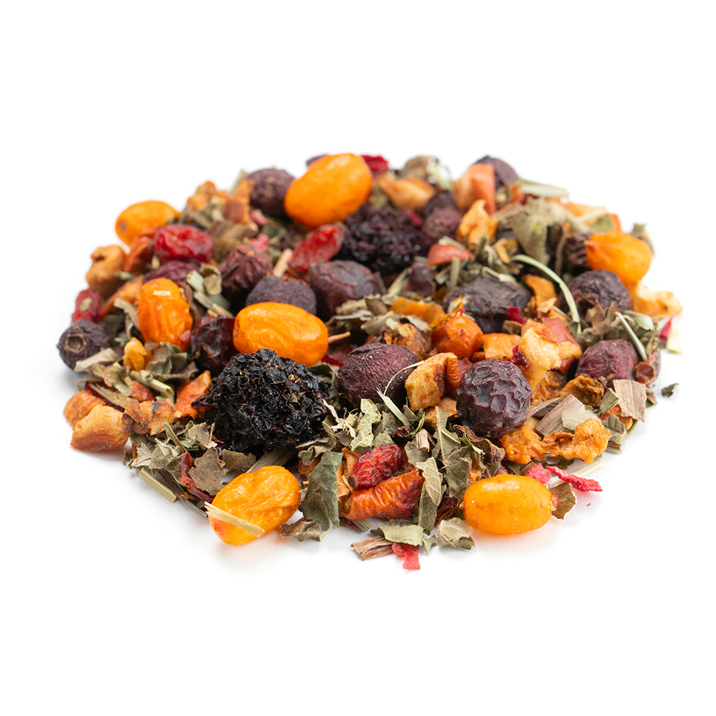 В сезон заболеваний данный витаминный фиточай идеально подойдет как источник восполнения недостающих активных веществ, поддерживающих здоровье организма. Данный напиток способен активизировать и усилить защитные функции, улучшить внутренние процессы для восстановления, снять перенапряжение и стресс. Данный напиток рекомендуется употреблять людям с ослабленным иммунитетом для профилактики заболеваний. Ценные травы насыщает организм огромным количеством витаминов и микроэлементов, оказывающих общеукрепляющее действие на организм. При регулярном употреблении данного фиточая наблюдается прилив энергии и бодрости, сокращается время на восстановление сил. Напиток имеет приятный и нежный травяной вкус, а послевкусие обладает кислинкой. Состав боярышник плоды, яблоко кусочки, шиповник плоды измельченные, ежевика лист, лимонная трава, барбарис плоды, ежевика ягоды, смородина лист, облепиха ягоды, клюква кусочки