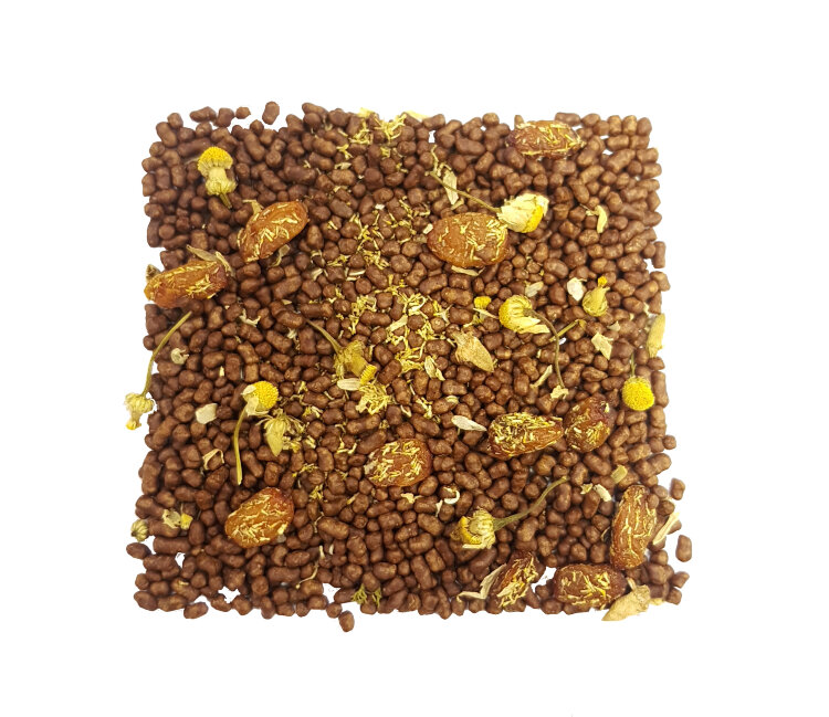 Гречишный чай Ку Цяо производится из светлых зёрен татарской гречихи, которая растет в горных районах Китая. Зерна гречихи после сбора подвергаются прожарке для усиления вкуса и аромата. В состав гречишного чая "Облепиха и Ромашка" помимо самого гречишного чая КуЦяо входят сушеные ягоды облепихи, сушены соцветия ромашки и ароматизатор. В традиционной китайской медицине принято считать, что напиток Ку Цяо усиливает энергию Ци и способствует гармоничному течению мыслей. Современные исследования показывают, что этот напиток способен понижать сахар в крови и поддерживать иммунитет. В сухом виде — светлые твёрдые зёрнышки, соцветия ромашки и сушеные ягоды облепихи с лёгким и приятным ароматом ромашки и облепихи. Подробнее о гречишном чае и его полезных свойствах. Вкус При заваривании получается настой ярко-желтого цвета, в аромате которого выделяются ноты овсяного печенья и ромашкового чая, а также чувствуется облепиховая нотка. Вкус у напитка сладковатый и приятный, успокаивающий. Это действительно удачное сочетание пользы ромашкового и гречишного чая, дополненное легкой ноткой облепихи. Послевкусие легкое и нежное. Как заваривать Заваривать при температуре 95-98°C, 2 чайных ложки на чайник 450 мл, в течение 1-3 мин. Для проливного метода — 8 г заварки на гайвань или колбу типода, в течение 5-15 сек.