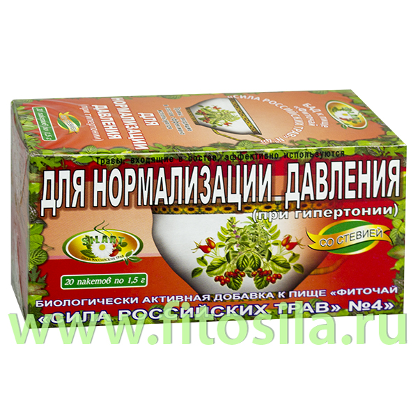Биологически активная добавка к пище фиточай "Сила Российских трав" №4 рекомендуется для нормализации давления и является источником флавоноидов (в том числе гиперозида и авикулярина), содержащей эфирные масла.