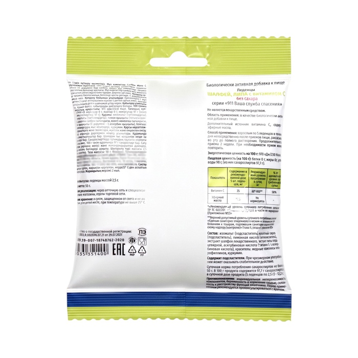 Леденцы 911 без сахара, шалфей, липа, витамин С, 50 г