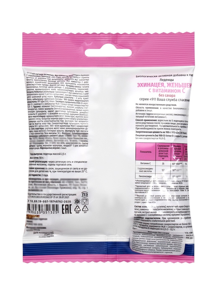 Леденцы от кашля911эхинацея, женьшень, витамин С, 50 г