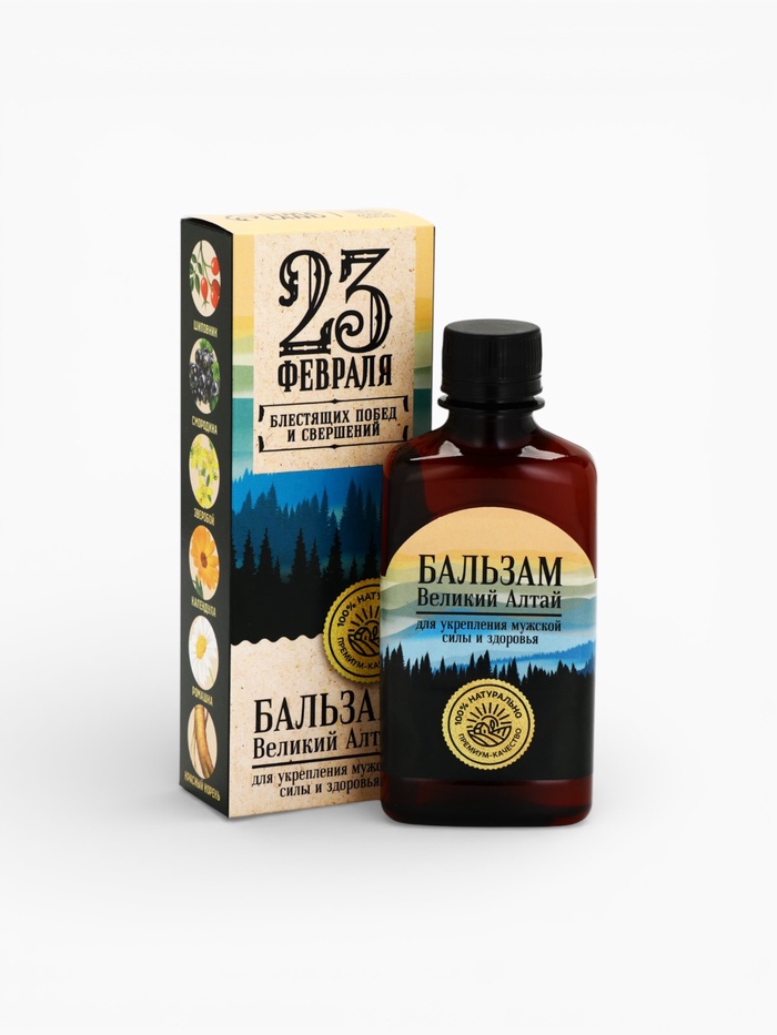 Бальзам «23 февраля»: красный корень, зверобой, золотой корень, шиповник, смородина, календула, ромашка, 250 мл.