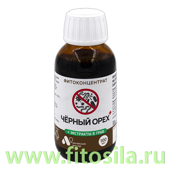 Чёрный орех - фитоконцентрат на основе экстракта околоплодников чёрного ореха и ещё 8 лекарственных растений противопаразитарного действия. Содержит вещества, которые активно подавляют развитие и размножение паразитов, способствуют очищению организма от токсичных продуктов их жизнедеятельности, создают условия, неблагоприятные для развития патогенной микрофлоры.