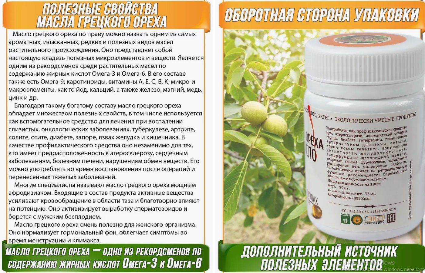 В оздоровительных целях ореховое масло применяют наружно в чистом виде или в составе мазей, кремов. Внутрь пьют по 2 ч. л. за полчаса до еды 2 раза в день.