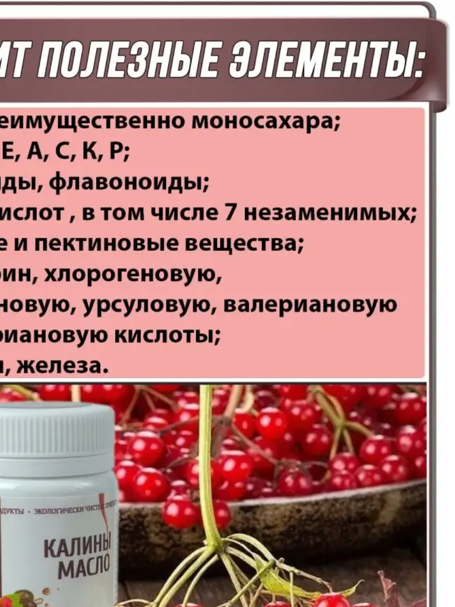 Cодержит сахара, преимущественно моносахара, витамины С, К, Р, каротиноиды, флавоноиды, 13 аминокислот , в том числе 7 незаменимых, дубильные и пектиновые вещества, В-ситостерин, хлорогеновую, неохлоргеновую, урсуловую, валериановую и изовалериановую кислоты; богаты солями калия, железа. Уникальность масла калины — в необычайно высоком содержании натурального витамина Е и провитамина А, которые являются самыми мощными антиоксидантами. Помимо этого присутствует витамин С, количество которого в 2 раза больше чем у цитрусовых.