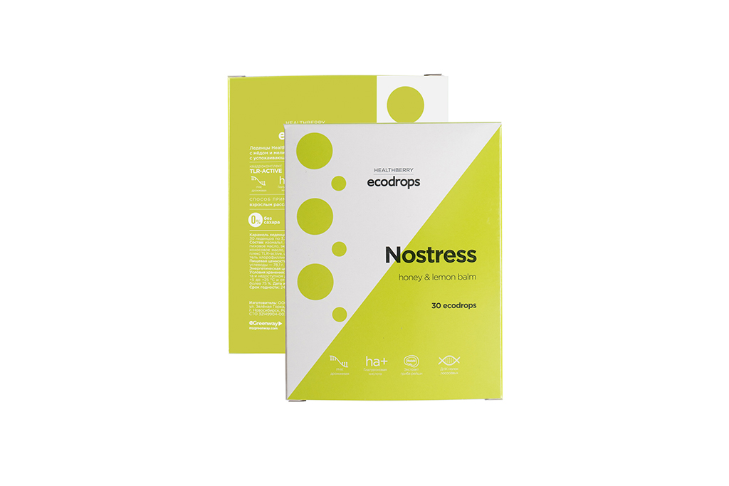 Карамель леденцовая с квадрокомплексом TLR-active — вкусная поддержка душевного равновесия. Леденцы не содержат сахара, поэтому безвредны для фигуры. Натуральные действующие компоненты в составе леденцов помогают поддерживать стабильный эмоциональный фон, бороться со стрессом и усталостью, а также обладают расслабляющим действием. Функциональные леденцы HEALTHBERRY ECODROPS — удобное вкусное решение для здоровья, красоты и отличного самочувствия в любой момент в течение дня! В состав леденцов HEALTHBERRY ECODROPS Nostress входят экстракт мелиссы, обладающий мягким седативным и расслабляющим действиями, а также зверобой, который является натуральным антидепрессантом и прекрасным общеукрепляющим средством. С леденцами HEALTHBERRY ECODROPS Nostress вы будете ощущать спокойствие в любых обстоятельствах. Леденцы не содержат сахара, поэтому не повлияют на фигуру. В основе — изомальт — современный натуральный сахарозаменитель, который обеспечивает организм энергией лучшего качества, не вредит зубам и подходит людям с сахарным диабетом. Способ применения Взрослым рассасывать 3–5 леденцов в день. Противопоказания и меры предосторожности Не имеет противопоказаний, кроме индивидуальной переносимости компонентов. Срок годности 24 месяца с даты изготовления. Условия хранения Хранить в сухом, защищённом от света и недоступном для детей месте при температуре от +5 до +25 °С и относительной влажности воздуха не более 75 %. Изомальт, патока, мёд, янтарная кислота, облепиховое масло, экстракт зверобоя, экстракт мелиссы, кокосовое масло, масло чайного дерева, квадрокомплекс TLR-active, циклодекстрин, мятное масло, краситель хлорофиллин. Квадрокомплекс TLR - active (гиалуроновая кислота, ДНК молок лососёвых, экстракт гриба рейши, РНК дрожжевая) включает четыре активных ингредиента, которые воздействуют на клеточные рецепторы (TLR-receptors) в слизистой рта и активируют клеточный иммунный ответ организма. Мёд и патока — отличные средства в борьбе со стрессом и для защиты нервной системы. Восстанавливают баланс углеводов, минералов и микроэлементов. Кроме того, мёд включает органические кислоты, витамин С и витамины группы В. Экстракты зверобоя и мелиссы активно применяются при борьбе с мигренью, неврологическими нарушениями и седативными расстройствами. Кокосовое, облепиховое, мятное масла являются одними из наиболее эффективных успокаивающих и расслабляющих средств, да к тому же мятное масло оказывает освежающий эффект. Янтарная кислота — отличный регулятор энергетического обмена, предназначенный для профилактики нарушений энергобаланса в организме. Пищевая и энергетическая ценность: Пищевая ценность на 100 г: белки — 0 г, жиры — 0,8 г, углеводы — 78,1 г. Энергетическая ценность на 100 г — 290 ккал / 1 214 кДж. Энергетическая ценность на 1 леденец (3,2 г) — 9 ккал.