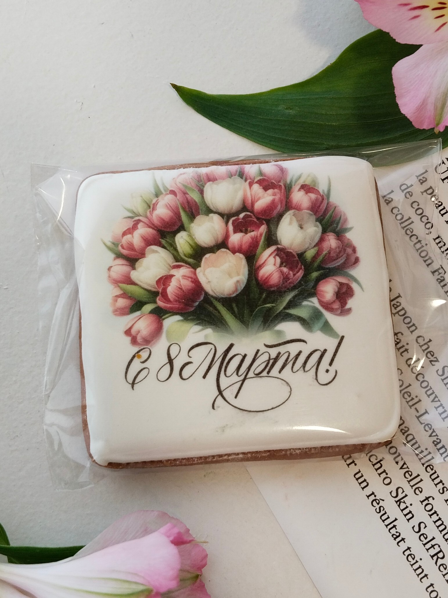 Пряник букет тюльпанов бело розовых