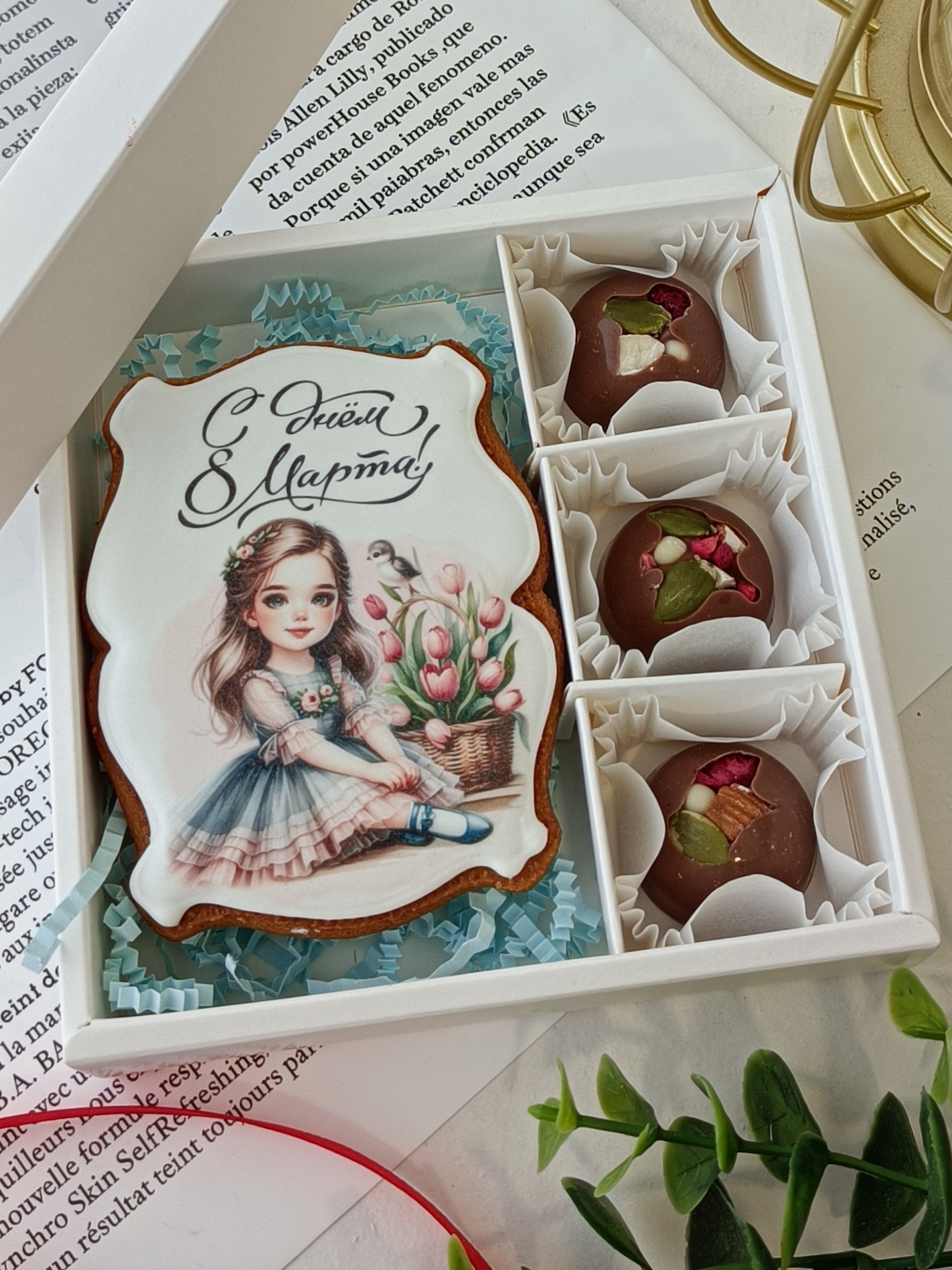 Девочка с корзиной тюльпанов+3 конфеты