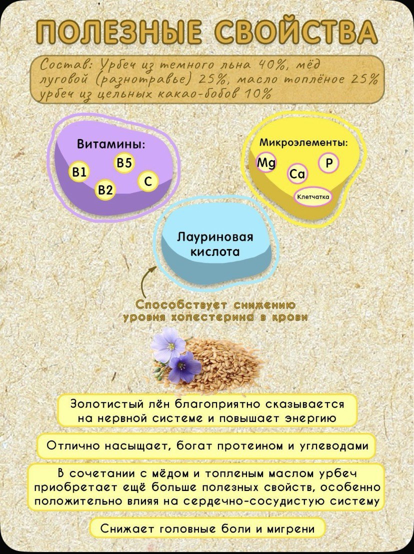 Урбеч из тёмного льна 40%, мёд луговой (разнотравье) 25%, масло топлёное 25% Урбеч из цельных какао-бобов 10%
