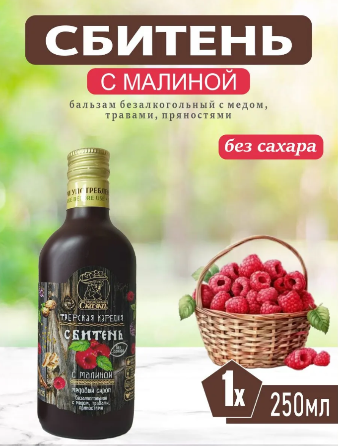 Сбитень Тверская Карелия с малиной без сахара, 250 мл стекло