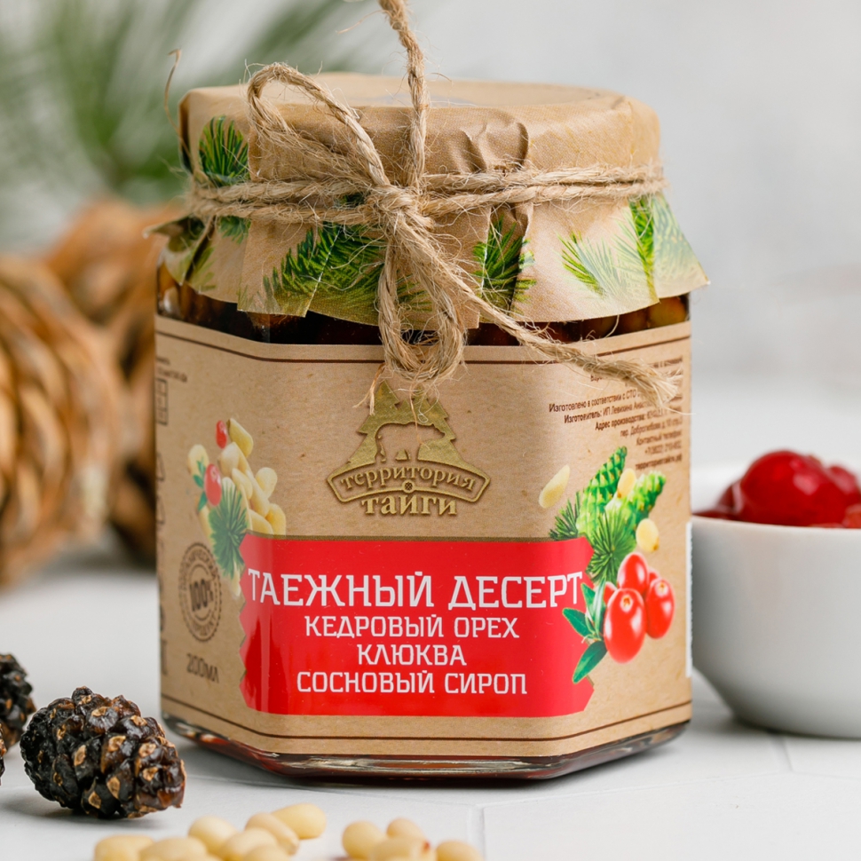 Таежный десерт - это восхитительное сочетание цельного кедрового ореха, ягод и соснового сиропа. В отличие от традиционного варенья, клюква и кедровый орех не подвергаются многократной тепловой обработке, а заливаются горячим сосновым сиропом, что позволяет сохранить их полезные свойства.