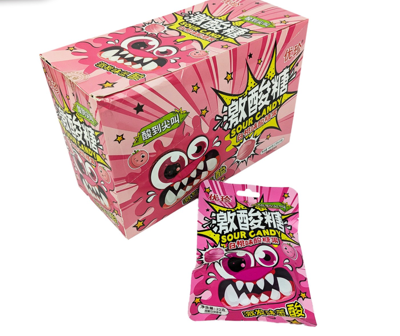 Кислые конфеты Yuzhen (Hongtai Kee Food) с шипучкой внутри со вкусом белого персика 22гр