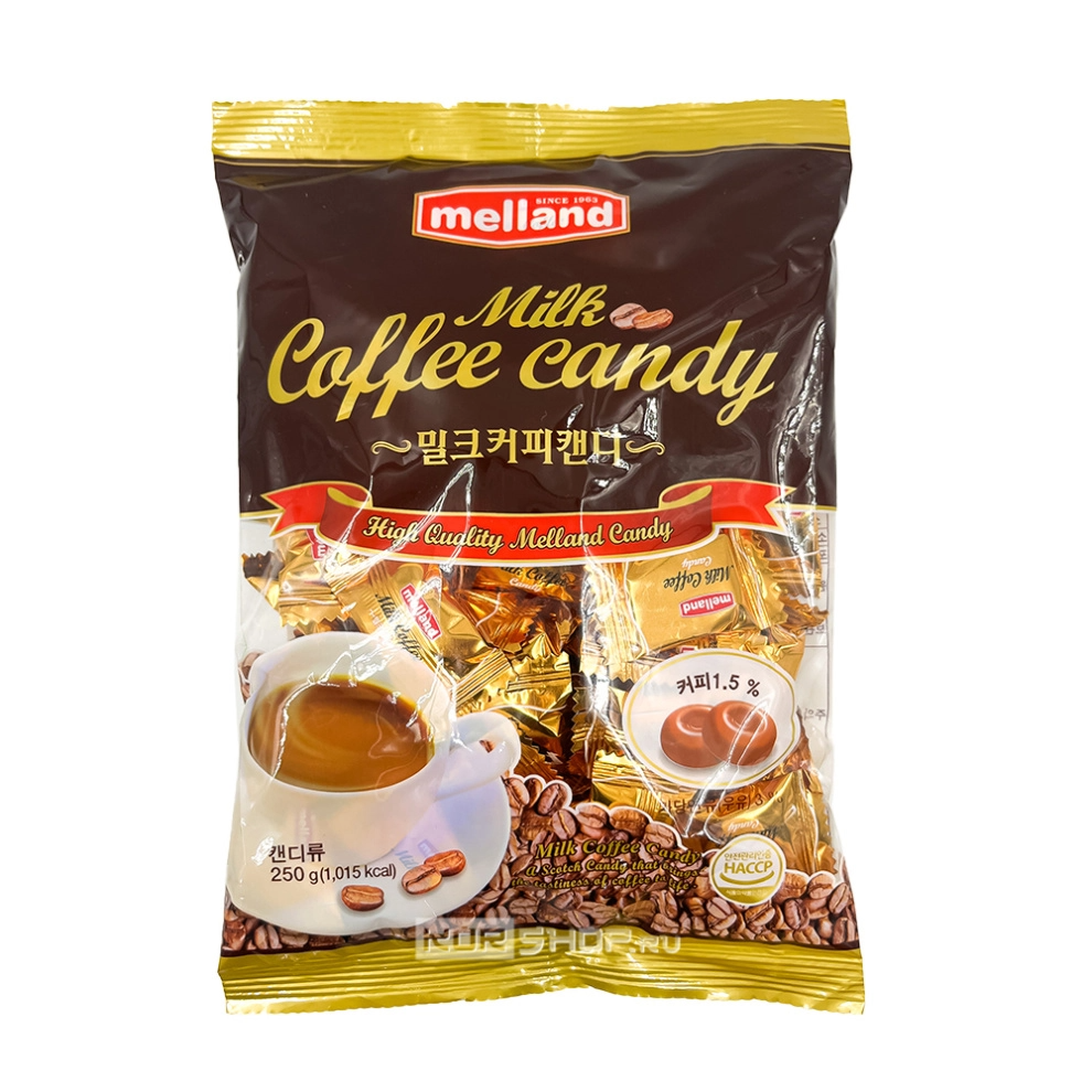 Карамель «Кофе с молоком» Milk Coffee Candy Melland – восхитительно вкусные корейские конфетки от известного и популярного в Стране Утренней Свежести бренда с пятидесятилетней историей, специализирующегося на производстве карамели с самыми разными вкусами, в том числе и весьма необычными и экзотическими. Эти конфетки приготовлены на основе сгущенного молока, кофе и сладкого сиропа. Они отличаются приятным насыщенным вкусом кофе с молоком и радуют кофеманов характерным ароматом. Конфеты не приторные, не горчат, имеют великолепно сбалансированный вкус. Ценители останутся довольны этим лакомством.
