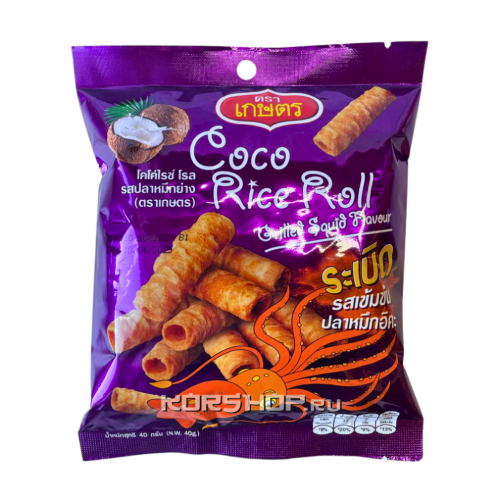 Хрустящие роллы со вкусом кальмара от компании Kaset — это идеальный снек для любителей морепродуктов. Они готовятся на основе высококачественного риса сорта жасмин с добавлением кокосового молока.