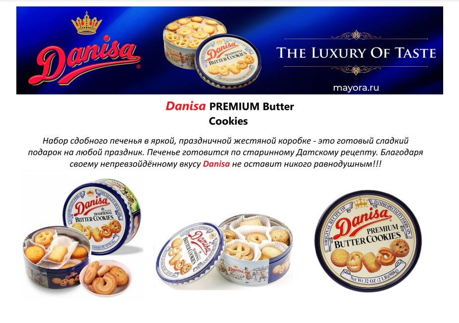Печенье сдобное Danisa, приготовленное по традиционному датскому рецепту, обладает насыщенным сливочным вкусом и нежным ванильным ароматом. Сверху печенье присыпано тонким слоем сахарного песка.