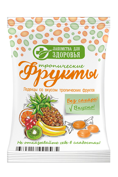 Содержание: подсластитель - изомальт, сироп мальтозный, регулятор кислотности - кислота лимонная, подсластитель – ацесульфам калия, ароматизатор натуральный мультифрукт, краситель пищевой натуральный экстракт паприки. Срок годности 24 месяца.