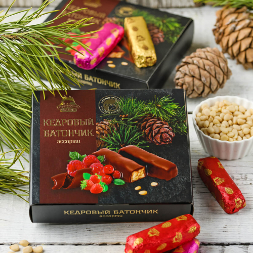 Артикул: 24050; Кол-во в месте: 5 шт.; Вес: 0.22 кг; Cрок годности: 6 месяцев; Состав: Кедровый трюфель с сосновой шишкой- темный шоколад (какао тертое, сахар, масло какао, соевый лецитин, натуральный ароматизатор "Ваниль"), масло сливочное, ядро кедрового ореха, молоко сгущенное, сахар, коньяк. Мягкий кедровый грильяж с клюквой- ядро кедрового ореха, мед натуральный, клюква сушеная, темный шоколад (какао тертое, сахар, масло какао, соевый лецитин, натуральный ароматизатор "Ваниль"). Кедровый марципан с черникой- мука кедрового ореха, сливки сухие молочные, сахар, черника сушеная, коньяк, темный шоколад (какао тертое, сахар, масло какао, эмульгатор лецитин, натуральный ароматизатор "Ваниль"). Кедровый батончик с земляникой- ядро кедрового ореха, сахар, мед натуральный, земляника сушеная, темный шоколад (какао тертое, сахар, масло какао, соевый лецитин, натуральный ароматизатор "Ваниль"), масло сливочное. Травяной чай- лист земляники, лист малины, лист мяты перечной, шиповник.; Условия хранения: Хранить при температуре от 15 до 21 градуса и относительной влажности воздуха не более 75%.; Пищевая и энергетическая ценность на 100 г: 474,76 ккал, белки 10,88 г, жиры 27,01 г, углеводы 49,28 г