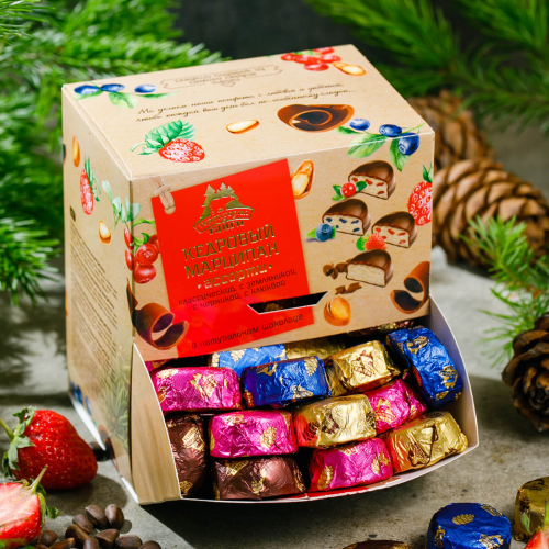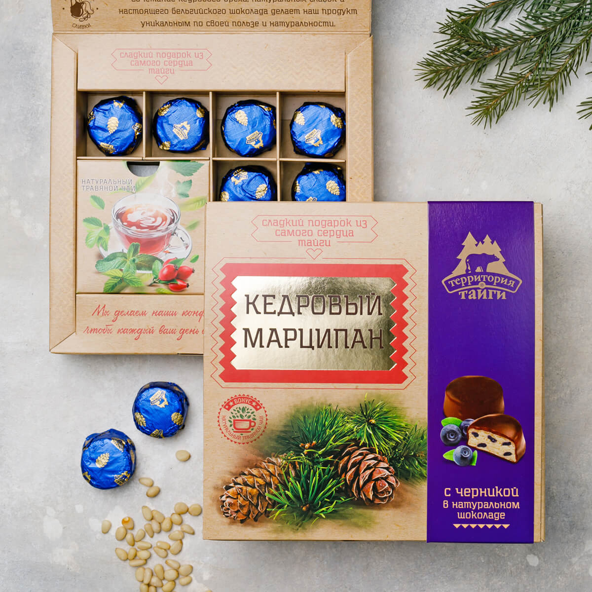 Состав: конфеты- мука кедрового ореха, сливки сухие молочные, сахар, черника сублимированная, темный шоколад (какао тертое, сахар, масло какао, соевый лецитин, натуральный ароматизатор "Ваниль"), коньяк; травяной чай- лист земляники, лист малины, лист смородины.