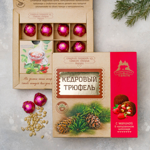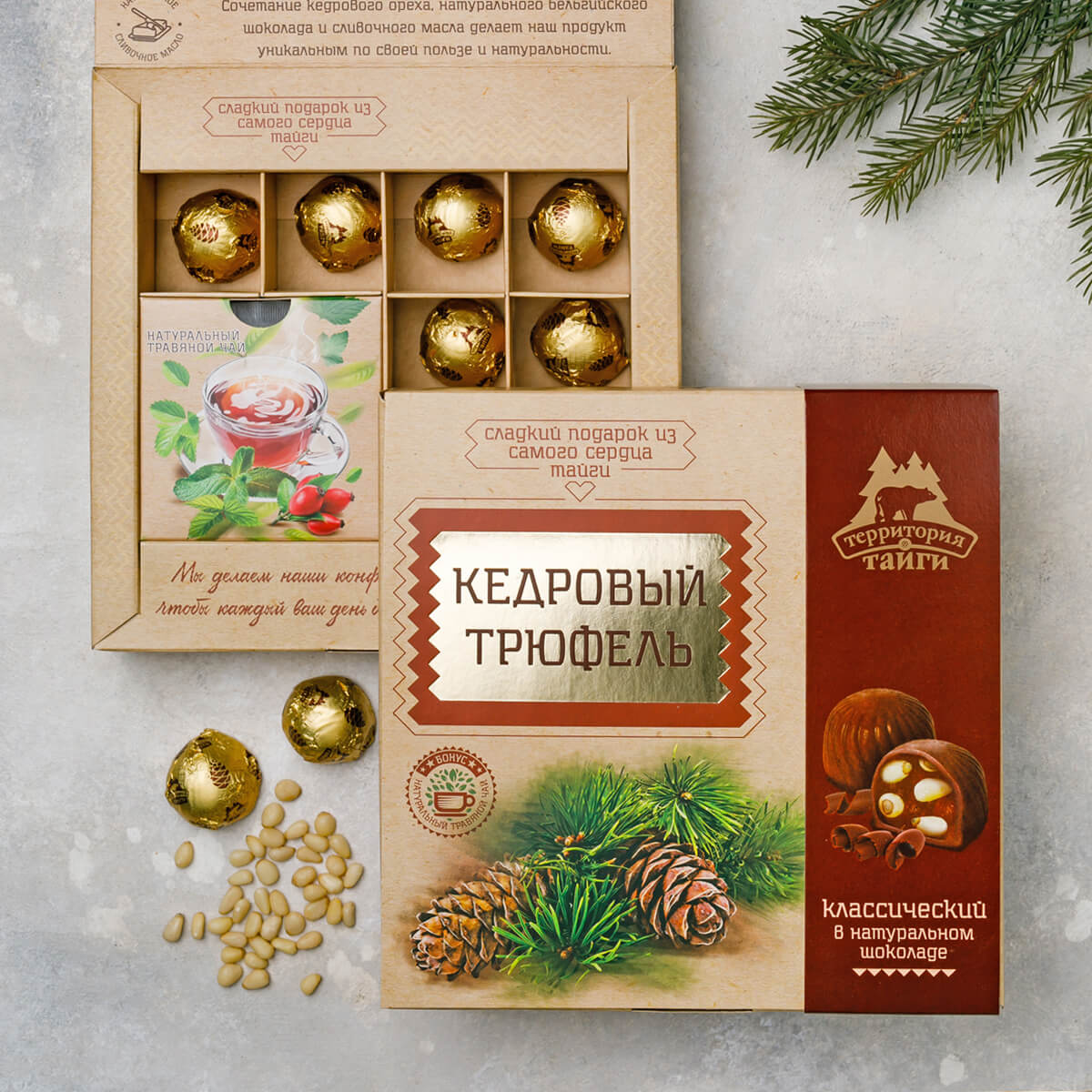 Состав: конфеты- темный шоколад (какао тертое, сахар, масло какао, соевый лецитин, натуральный ароматизатор "Ваниль"), масло сливочное, ядро кедрового ореха, молоко сгущенное, сахар, коньяк; травяной чай- лист земляники, лист малины, лист смородины.
