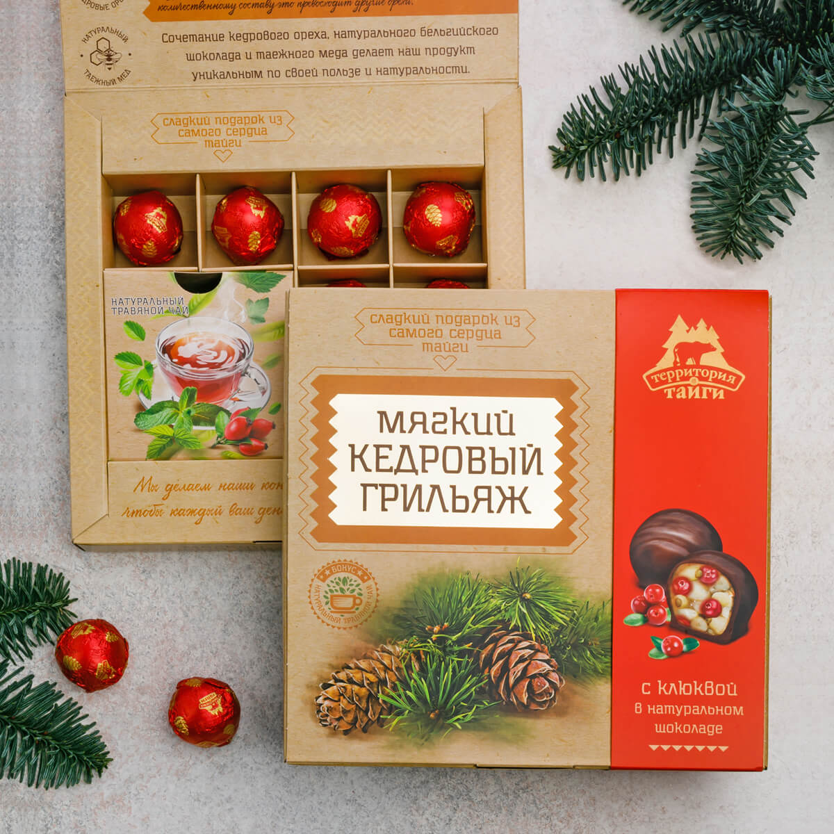 Состав: конфеты- ядро кедрового ореха, мед натуральный, клюква сублимированная, темный шоколад (какао тертое, сахар, масло какао, соевый лецитин, натуральный ароматизатор "Ваниль"), лимонная кислота; травяной чай- лист земляники, лист малины, лист смородины.