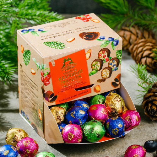 Состав: ядро кедрового ореха, мед натуральный, молодые сосновые шишки, темный шоколад (какао тертое, сахар, масло какао, соевый лецитин, натуральный ароматизатор "Ваниль"), лимонная кислота.