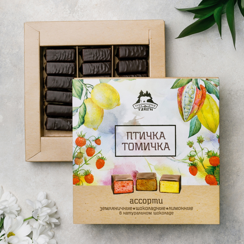 Артикул: 28066; Кол-во в месте: 6 шт.; Вес: 0.295 кг; Cрок годности: 91 день; Состав: Конфета лимонная- сахар, патока, шоколад темный (какао тертое, сахар, масло какао, соевый лецитин, натуральный ароматизатор "Ваниль"), вода питьевая, масло сливочное, молоко сгущенное, яичный белок, загуститель агар-агар, лимонная кислота, сорбат калия, натуральный ароматизатор "Лимон", натуральный краситель куркумин. Конфета земляничная- сахар, патока, шоколад темный (какао тертое, сахар, масло какао, соевый лецитин, натуральный ароматизатор "Ваниль"), вода питьевая, масло сливочное, молоко сгущенное, яичный белок, сублимированная земляника, загуститель агар-агар, лимонная кислота, сорбат калия. Конфета шоколадная- сахар, патока, шоколад темный (какао тертое, сахар, масло какао, соевый лецитин, натуральный ароматизатор "Ваниль"), вода питьевая, масло сливочное, молоко сгущенное, какао-порошок, яичный белок, загуститель агар-агар, лимонная кислота, сорбат калия, натуральный ароматизатор "Ром".; Условия хранения: Хранить при температуре от 15 до 21 градуса и относительной влажности воздуха не более 75%.; Пищевая и энергетическая ценность на 100 г: 380 ккал, белки 2 г, жиры 17 г, углеводы 54 г