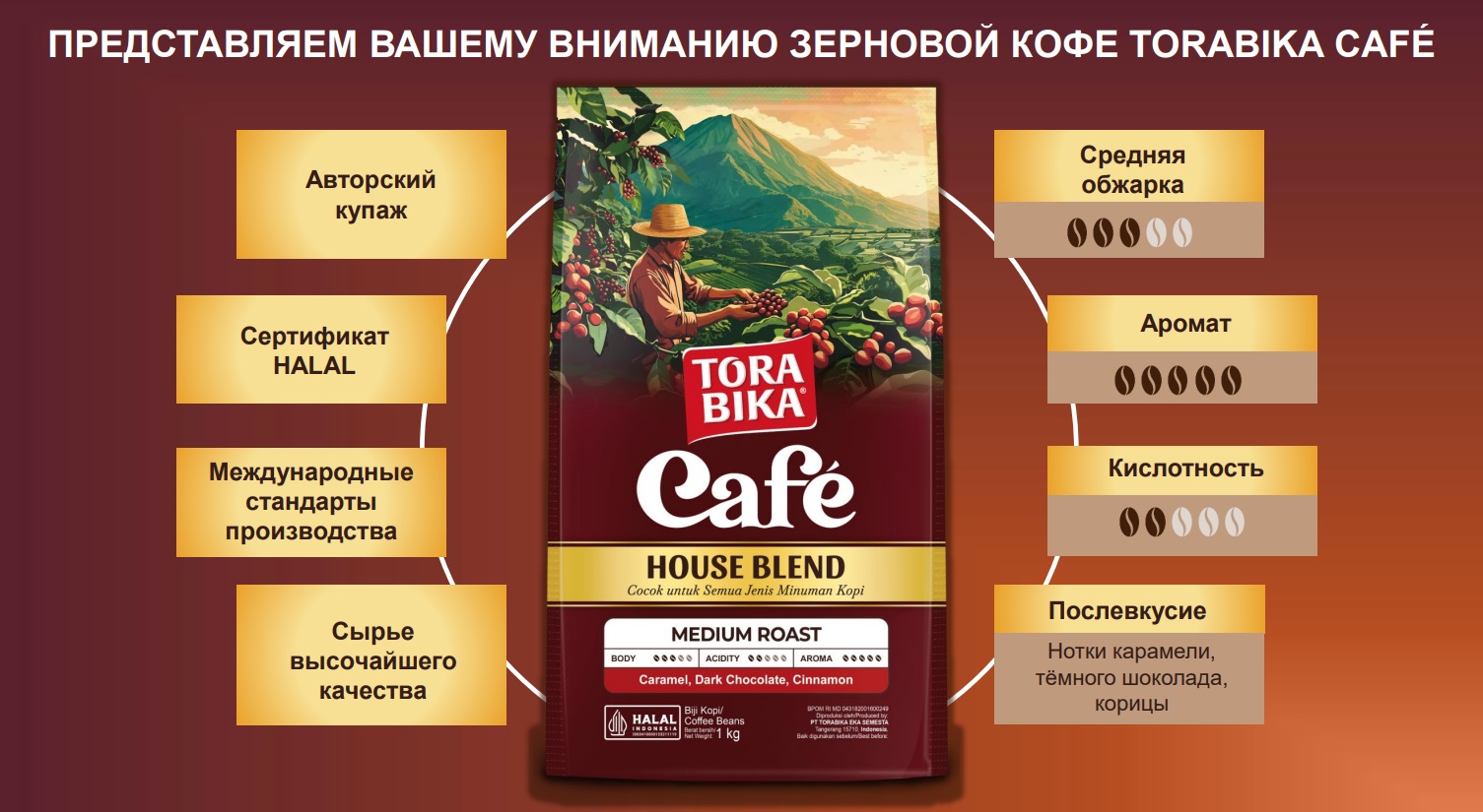 Кофе в зёрнах Torabika Café 1 кг — это бренд отборных зёрен из Индонезии. Авторский купаж зёрен высокого качества дарит сбалансированный вкус с нотками карамели, тёмного шоколада и корицы и приятным послевкусием в каждой чашке.