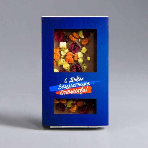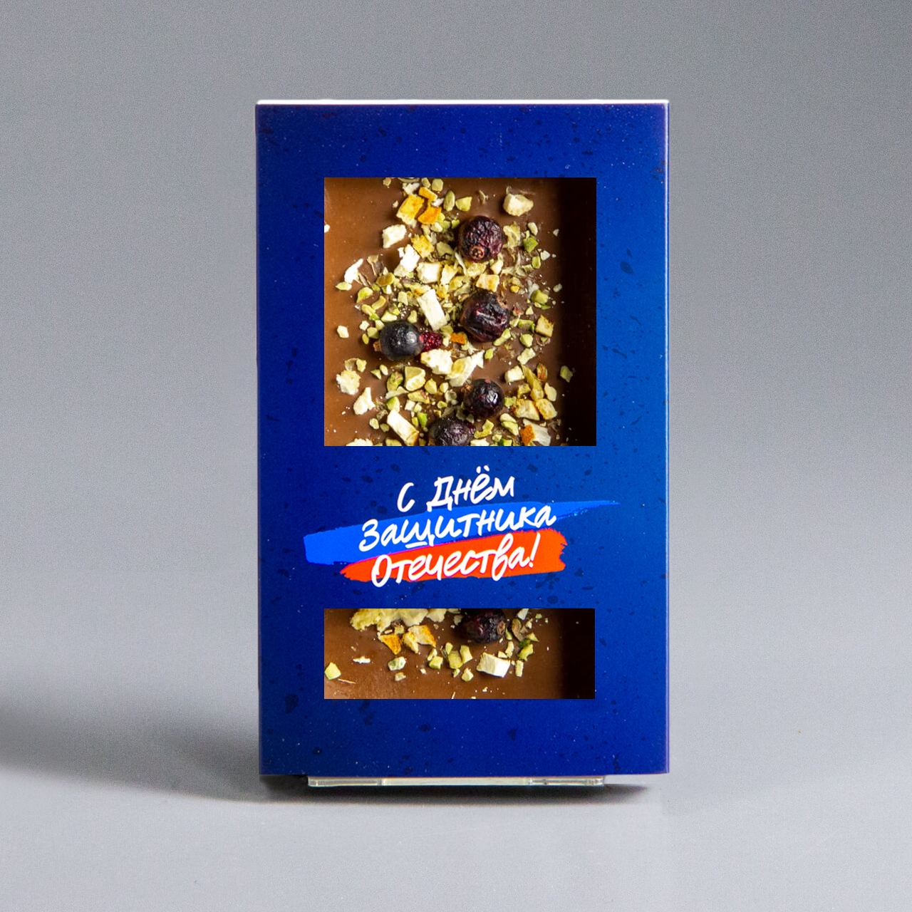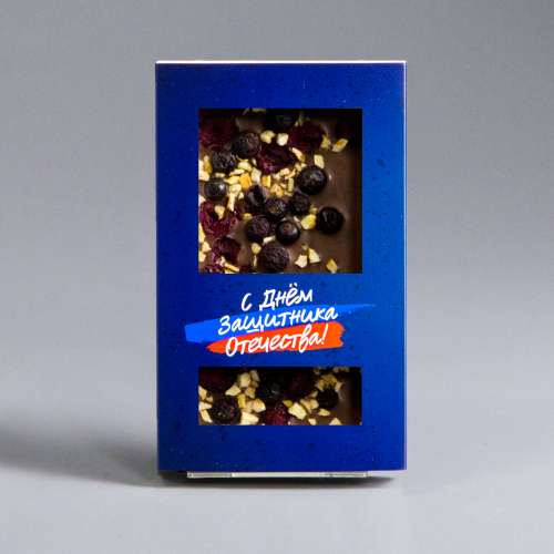 Молочный шоколад с апельсином, чёрной смородиной и фисташками, синяя коробочка #4