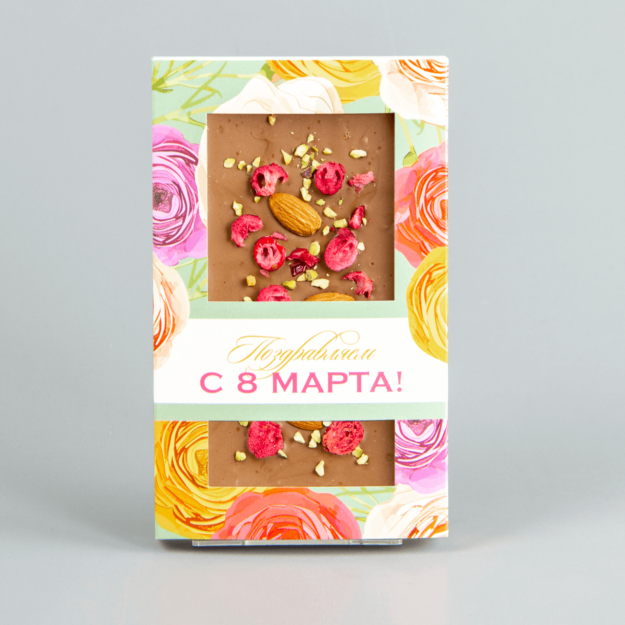 Молочный шоколад с клюквой, миндалём и фисташками, коробочка с 8 марта #19