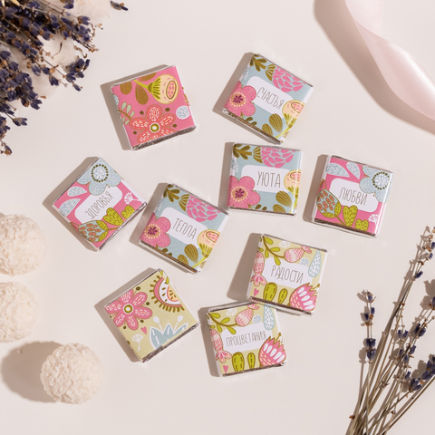 Каждая шоколадка упакована в индивидуальную этикетку с пожеланием.