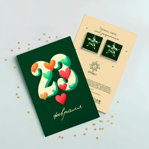 Открытка 2 шоколадки "23 февраля (зелёная с сердечками)"