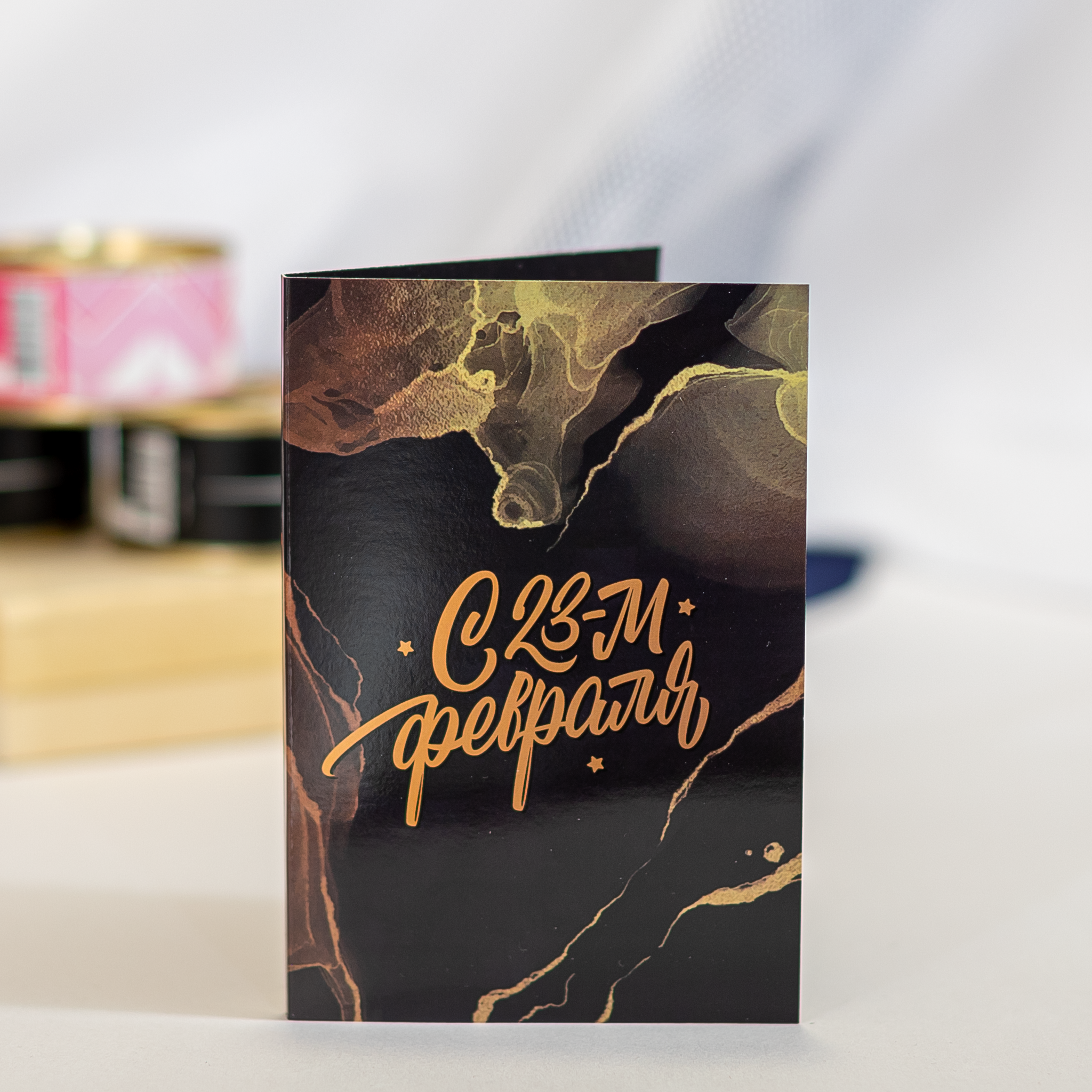 Открытка 4 шоколадки "С 23 февраля" (тёмная с разводами)