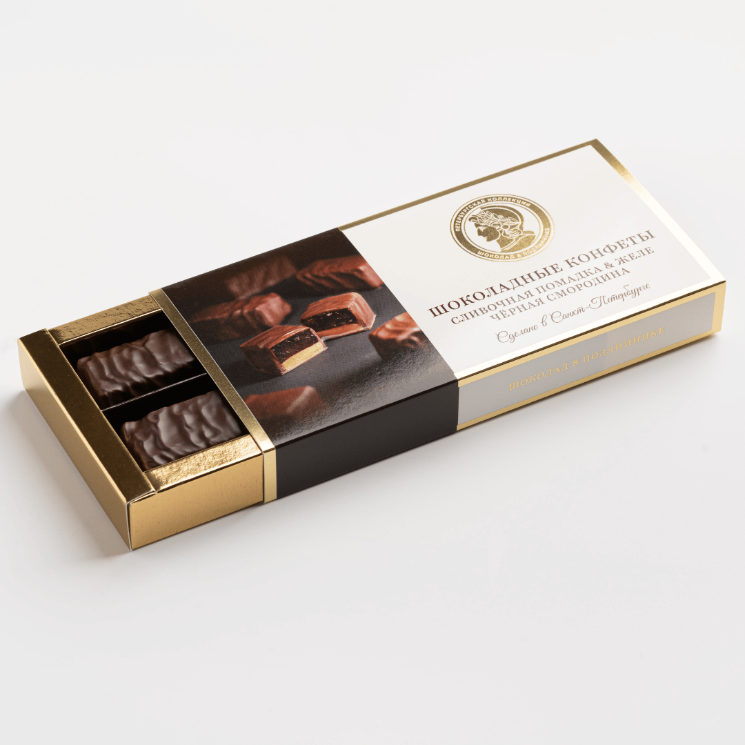 Нежная сливочная помадка с желе из натуральных ягод чёрной смородины без добавления красителей и ароматизаторов, покрытая натуральным тёмным шоколадом. Удобная упаковка для приятных моментов в любом месте. Состав: сахар, чёрная смородина, сгущённое молоко (цельное молоко, сахар), патока, сливочное масло 82%, желирующий агент - пектин, ваниль, регуляторы кислотности: лимонная кислота, цитрат натрия; тёмный шоколад (какао тёртое, какао масло, сахар, эмульгатор - лецитин, ваниль). Содержание какао продуктов не менее 55%. Противопоказано при индивидуальной непереносимости лецитина. Продукт может содержать следы: арахиса, орехов, глютена, молочного белка. Хранить при температуре 18±3ºС и относительной влажности воздуха не более 75%. Беречь от тепла! Система менеджмента безопасности пищевых продуктов фабрики сертифицирована и соответствует требованиям международного стандарта ISO 22000-2019 (HACCP).