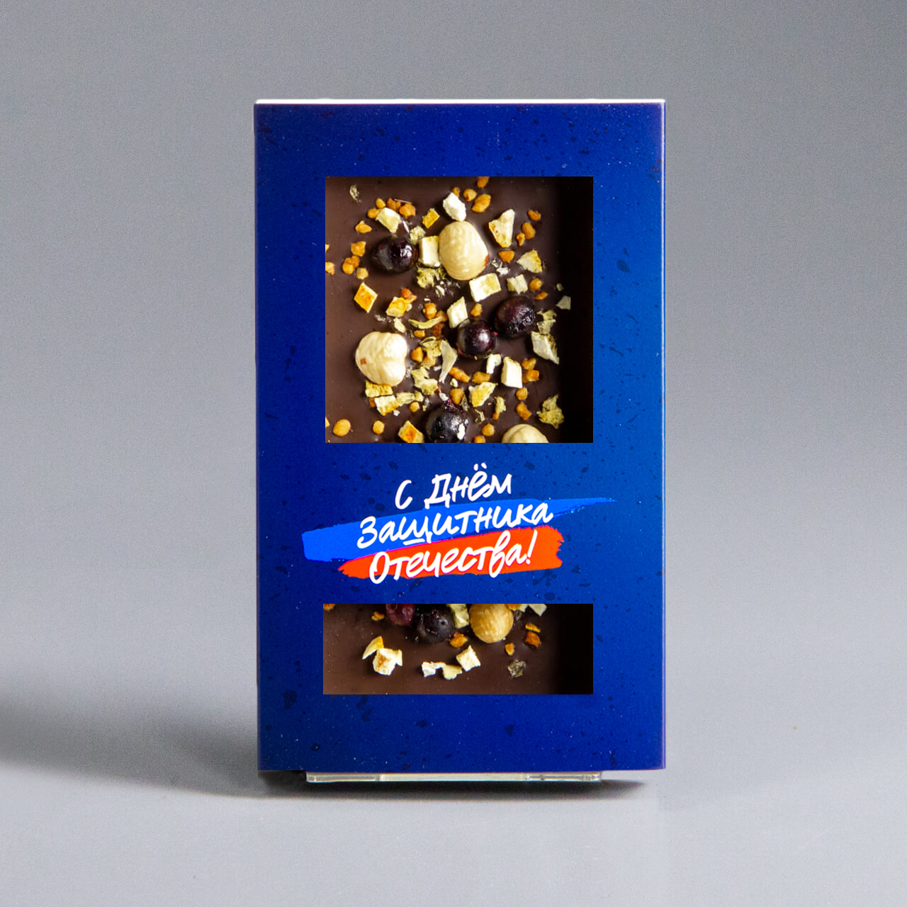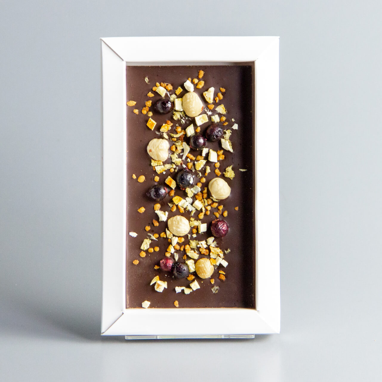 Тёмный шоколад с апельсином, чёрной смородиной, фундуком и карамелизированным фундуком, синяя коробочка #5